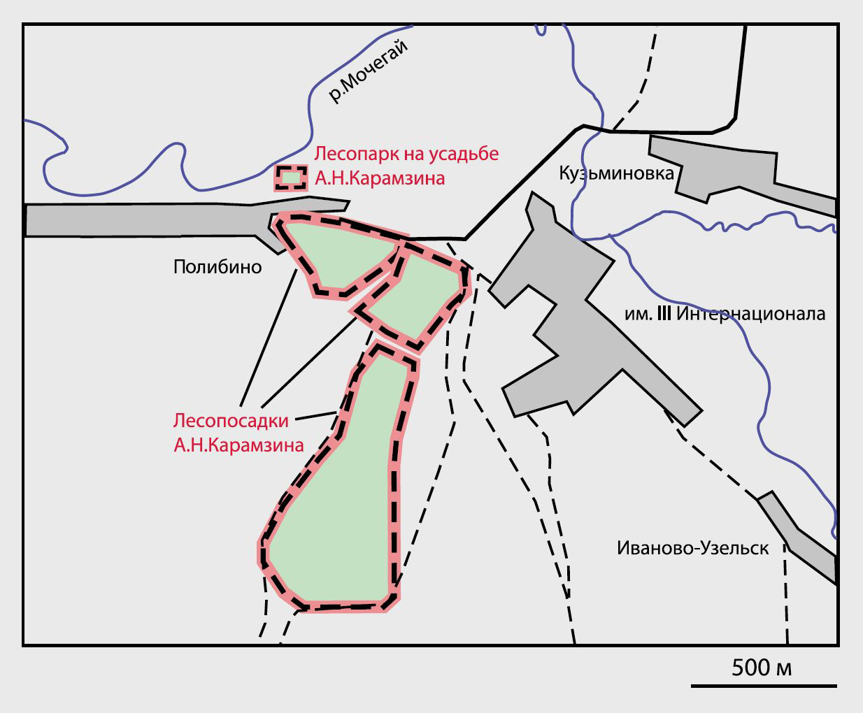 Посадки созданы А.Н. Карамзиным в 1870–1880-е годы с целью изучения возможностей степного лесоразведения в долине реки Мочегай. В насаждениях испытаны культуры сосны, лиственницы, тополя, имеются хорошие насаждения дуба, липы, березы, из кустарников – черемуха, боярышник, рябина, акация желтая.