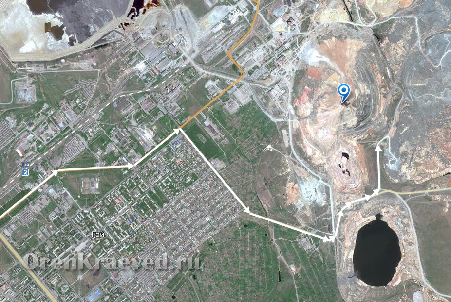 Из города Гая двигаться в юго-восточном направлении до карьера № 2, затем повернуть на север объезжая карьер с западной стороны. В точке N51.46950° E58.49235° свернуть с дороги на север и двигаться до карьера.