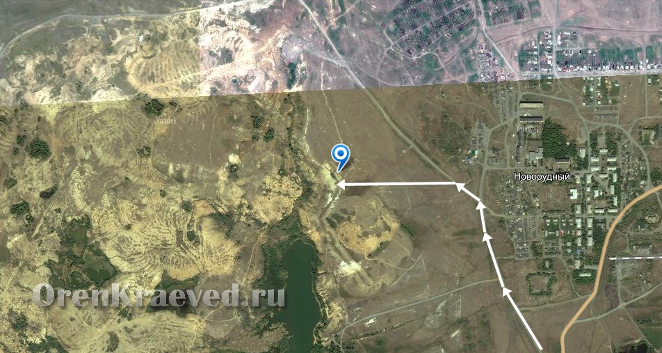 Из посёлка Новорудный двигаться в западном направлении до карьера.