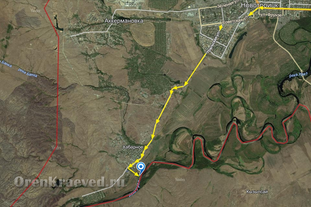Из Орска двигаться в Новотроицк. Проехать через Новотроицк по улице Советской, свернуть на улицу Уральская, далее двигаться до села Хабарное.