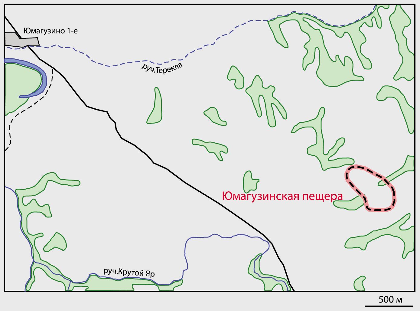 Южный склон горы обрывист, в верхней части образует уступ, в котором находится узкий вход в пещеру, называемую Юмагузинской. Протяженность пещеры не велика, около 50 м. Подземная полость закладывалась по системе трещин, в дальнейшем расширенных растворяющей деятельностью проникающих с поверхности вод.