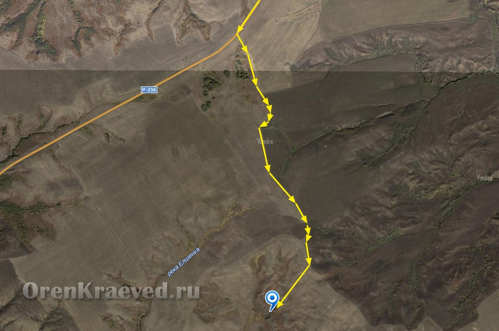 С трассы Р-336 свернуть на юго-восток в точке N51.32573° E57.60985°. Далее по полевой дороге до точки N51.30152° E57.62168°. Затем пешком на юго-запад до точки N51.29715° E57.61488°.