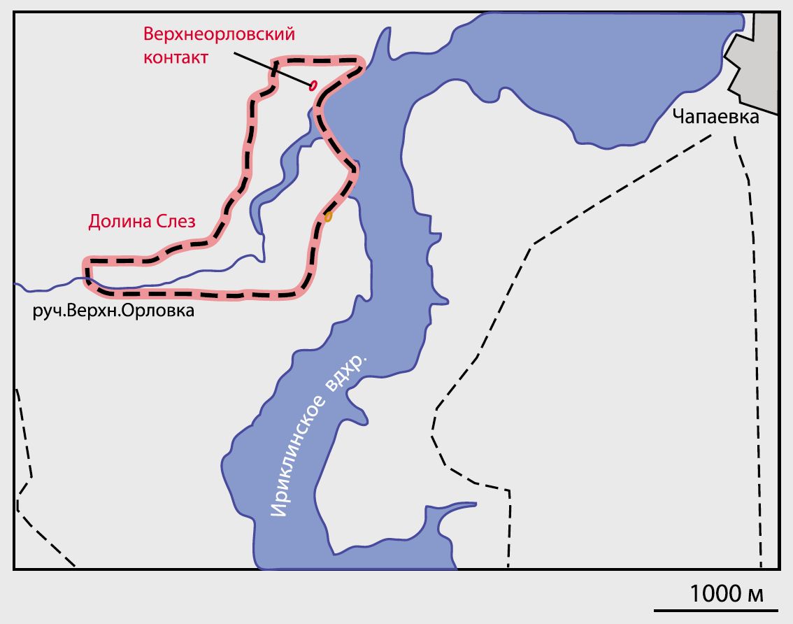 В обрыве над Верхнеорловским заливом Ириклинского водохранилища обнажен стратиграфический контакт вулканических отложений (гематизированных диабазовых порфиритов) с известняками. Известняки залегают на порфиритах с хорошо видимым размывом, в базальной части в известняках много обломков измененных порфиритов. Известняки переполнены остатками фауны (одиночные кораллы, брахиоподы).