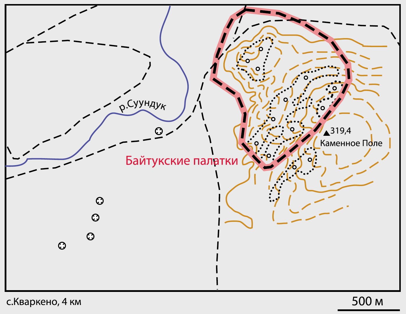Байтукские палатки, один из лучших естественных выходов гранитов Суундукского массива, часто посещаются туристами. Встречаются древние разработки гранитов, возможно бронзового века, так как плиты гранитов Суундукского массива встречаются в облицовке крепостного вала недалеко расположенного Аландского городища эпохи бронзы.