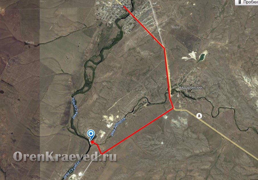 Из Кваркено двигаться на юго-восток в сторону посёлка Айдырлинский, южнее посёлка повернуть на юго-запад на дорогу ведущую в посёлок Майский. В точке N52.02819° E59.70979° свернуть на север и двигаться к броду через реку Айдырля (брод - N52.03229° E59.70968°). Далее пешком ~400 метров на северо-запад до точки N52.03357° E59.70376°.
