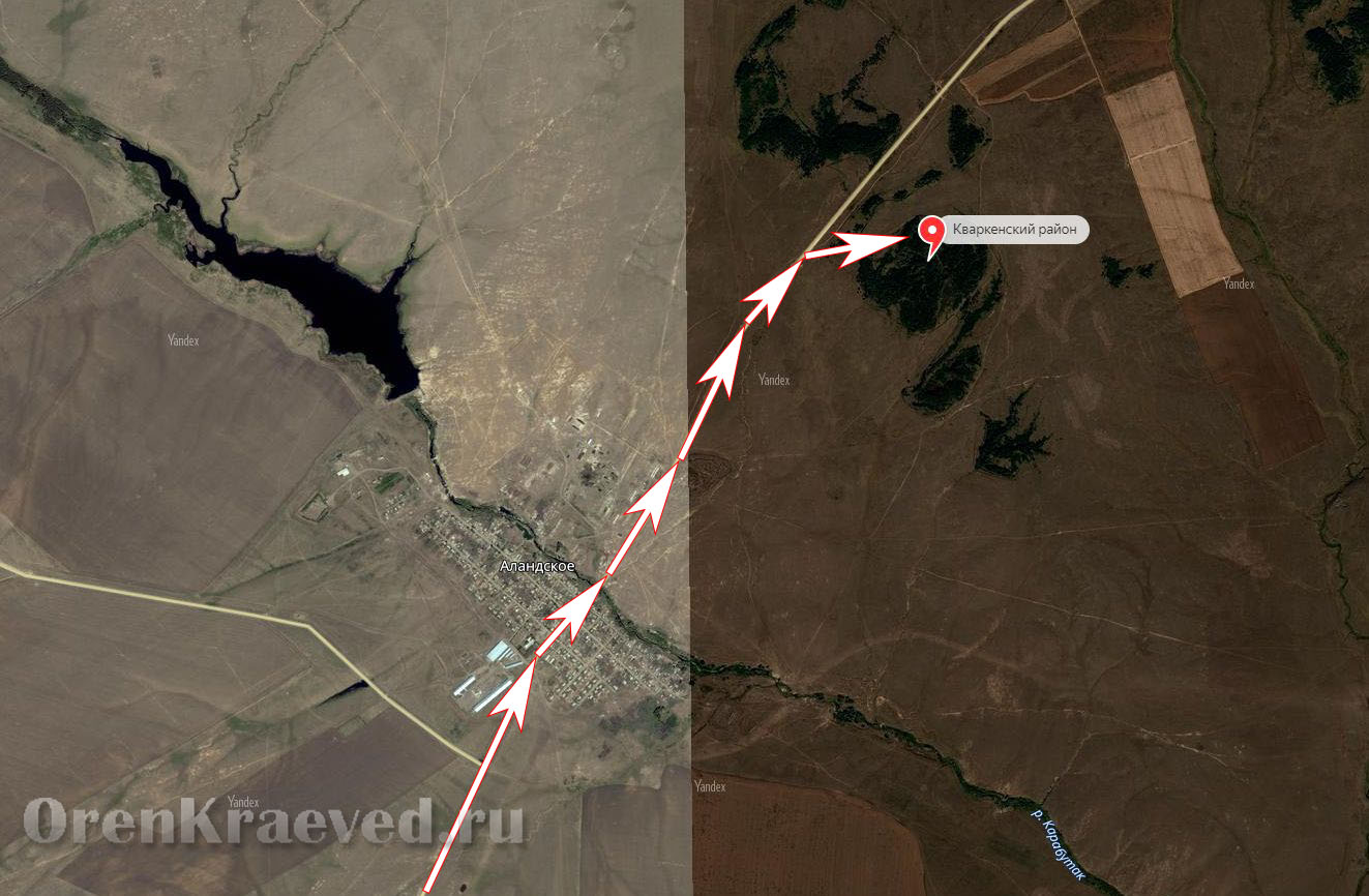 В 3 км к северо-востоку от села Аландского. Болотовское лесничество, кв. 59. Кваркенский лесхоз.