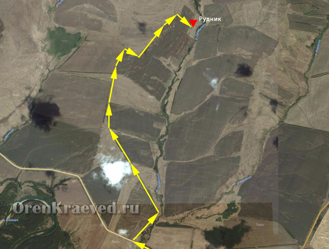 Из села Татарский Саракташ двигаться в сторону села Гавриловка. В точке 51°51′20″N, 56°20′22″E (51.855600, 56.339433) свернуть на север и двигаться по дороге до точки 51°54′4″N, 56°21′6″E (51.901057, 56.351625). Далее по полю на запад до рудника.