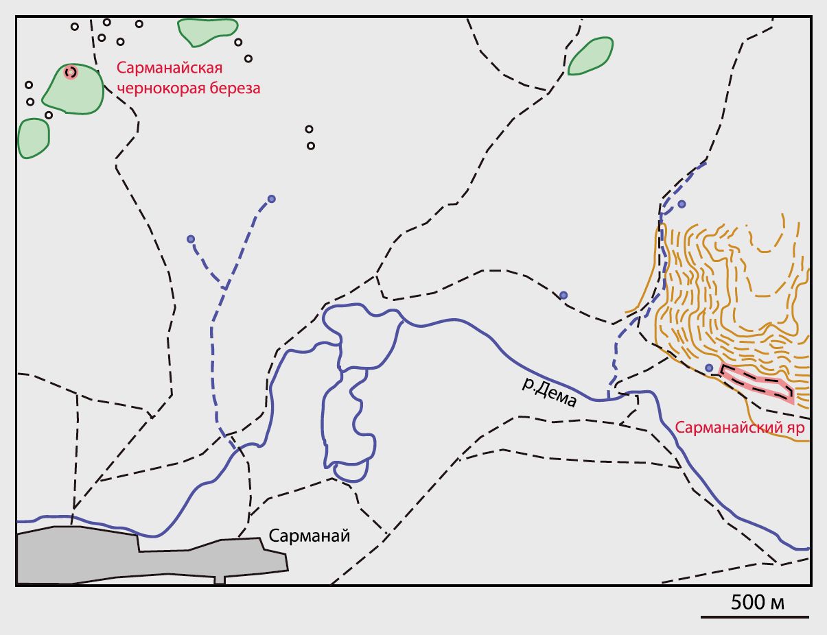 В 1,5 км к СЗ от с. Сарманай. Шарлыкское лесничество, кв. 60 (выд. 42). Шарлыкский лесхоз.