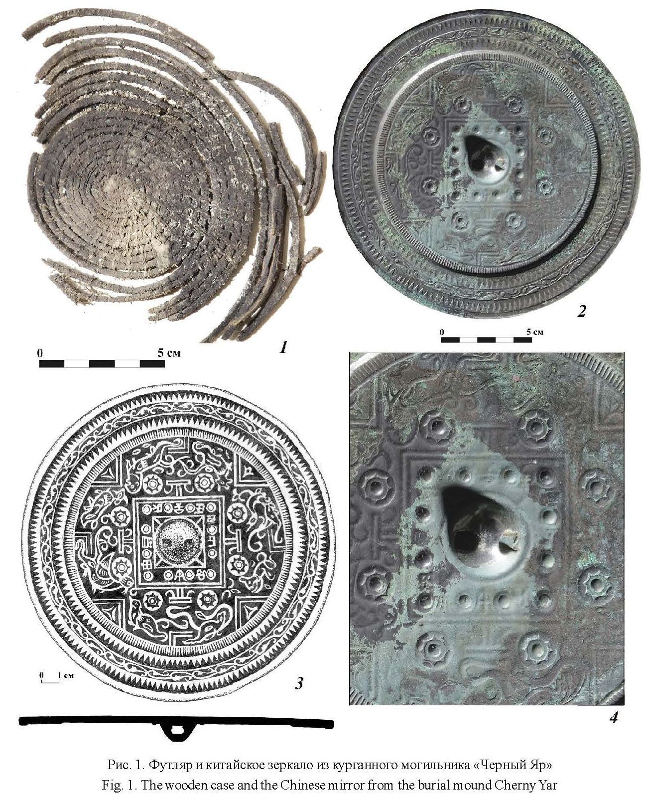 Зеркало представляло собой круглый диск диаметром 17 см с петлевидной ручкой по центру. Толщина диска 4-5 мм, диаметр ручки 2,2 см, высота ручки-петельки 1 см. Внешнюю поверхность зеркала (со стороны ручки) украшал сложный орнамент. К сожалению, из-за затертости и патины он не весь четко читался, но благодаря наблюдениям под микроскопом (МБС-10) и применению техники сведения рисунка путем калькирования графитом удалось разглядеть большую часть изображений (рис. 1, 2-3).
