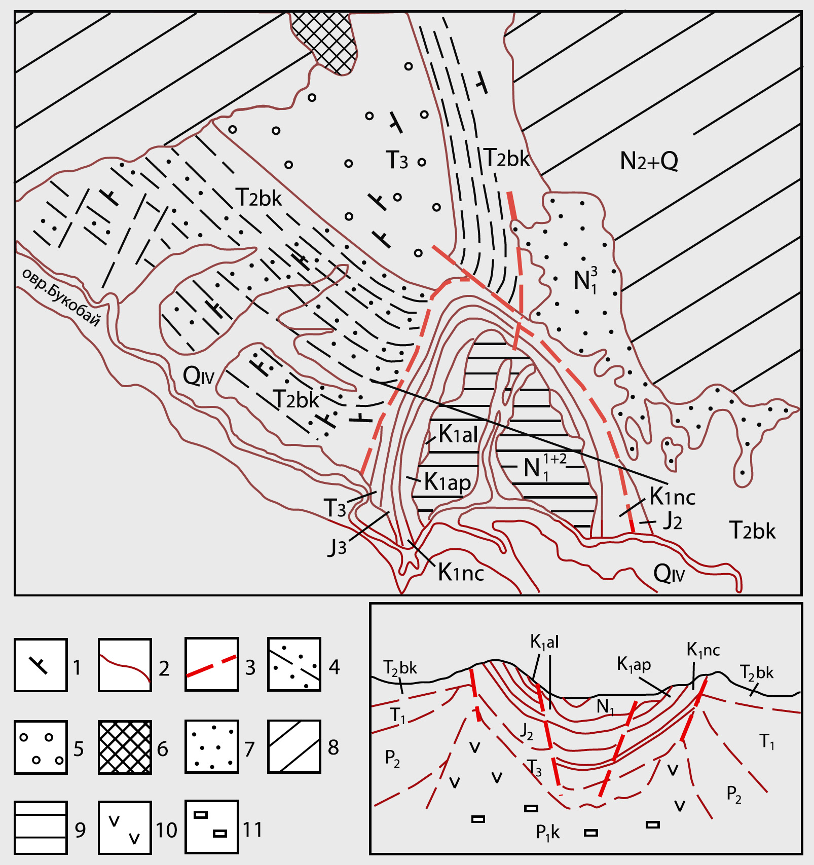Условные обозначения: 1 – простирание и направление падения слоев; 2 – геологические границы; 3 – разрывные нарушения; 4 – букобайская серия – преимущественно красноцветные терригенные породы; 5 – суракайская свита – сероцветные терригенные породы; 6 – континентальные породы средней юры; 7 – галечники, пески позднего (?) миоцена; 8 – суглинки, глины позднего неогена и четвертичного возраста; 9 – угленосные породы нижнего-среднего миоцена; 10 и 11 – гипсы, каменные соли кунгурского возраста