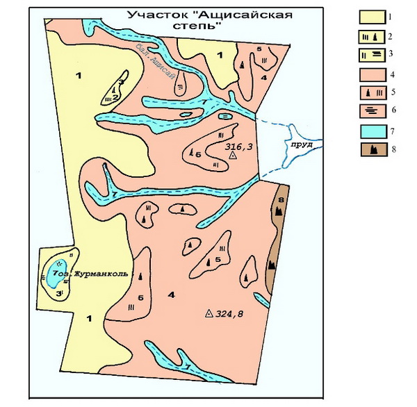 В ландшафтно-типологическом отношении Ащисайскую степь представляют типы местности: междуречный недренированный озерно-западинный, волнистый ложково-склоновый и останцово-водораздельный скалисто-грядовый.