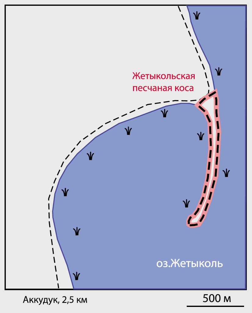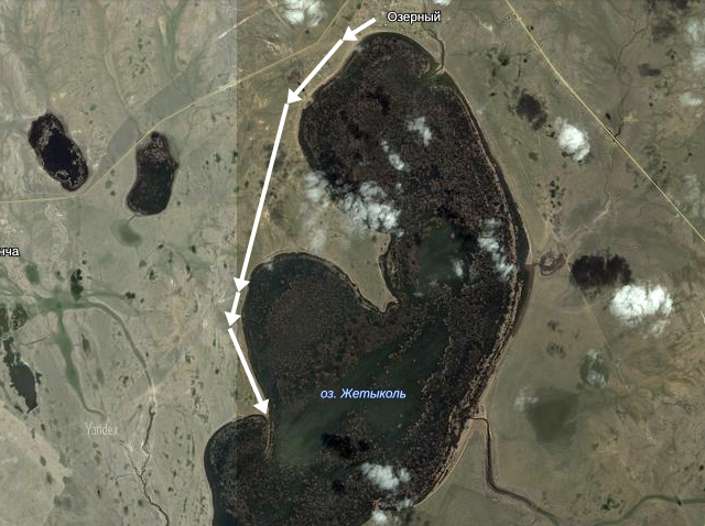 Из посёлка Озерный двигаться вдоль западного побережья озера Жетыколь миную «карман» до начала песчаной косы.