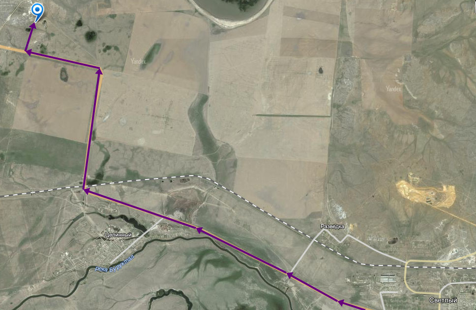 Из посёлка городского типа Светлый двигаться по дороге в Ясный. Свернуть с дороги на север в точке N50.87944° E60.69503°.