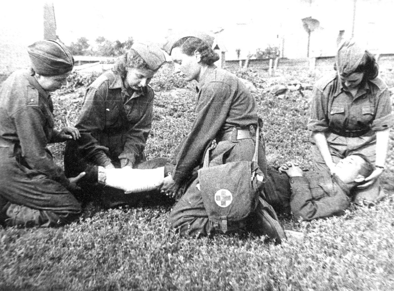 Тренировка санинструкторов 1-го Чехословацкого отдельного батальона. Первая слева — Ида Давидовичова. Бузулук, 1942 г.