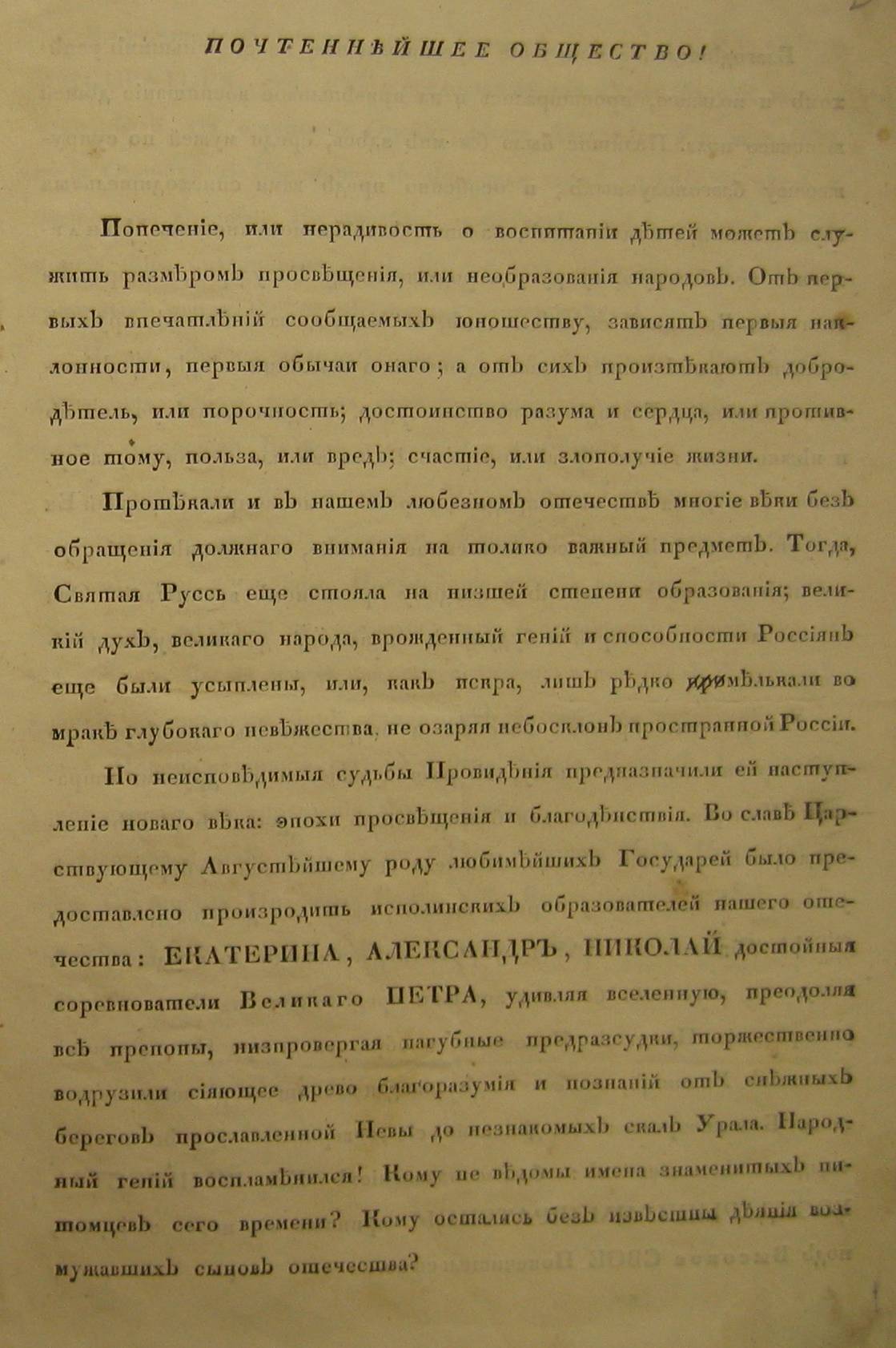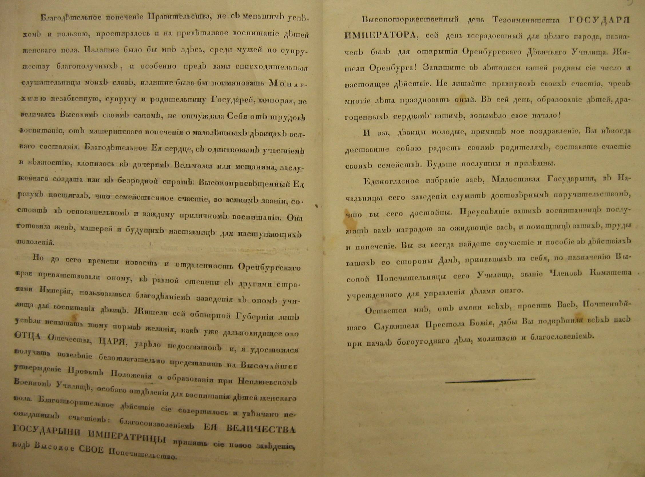 6 декабря. Сего числа, день Тезоимства Его Императорского Величества Всеавгустейшего Государя Императора Николая Павловича ознаменован торжественным открытием учрежденного при Неплюевском военном училище Оренбургского девичьего училища, которое Ея Императорскому Величеству Государыне Императрице Александре Федоровне благоугодно было принять под высокое свое попечительство. Открытие сего заведения началось после божественной литургии кратким приветствием многочисленной публики сказанным Его Сиятельсвом, господином Оренбургским Военным Губернатором графом Сухтеленом 2-ым и при сем приложен.