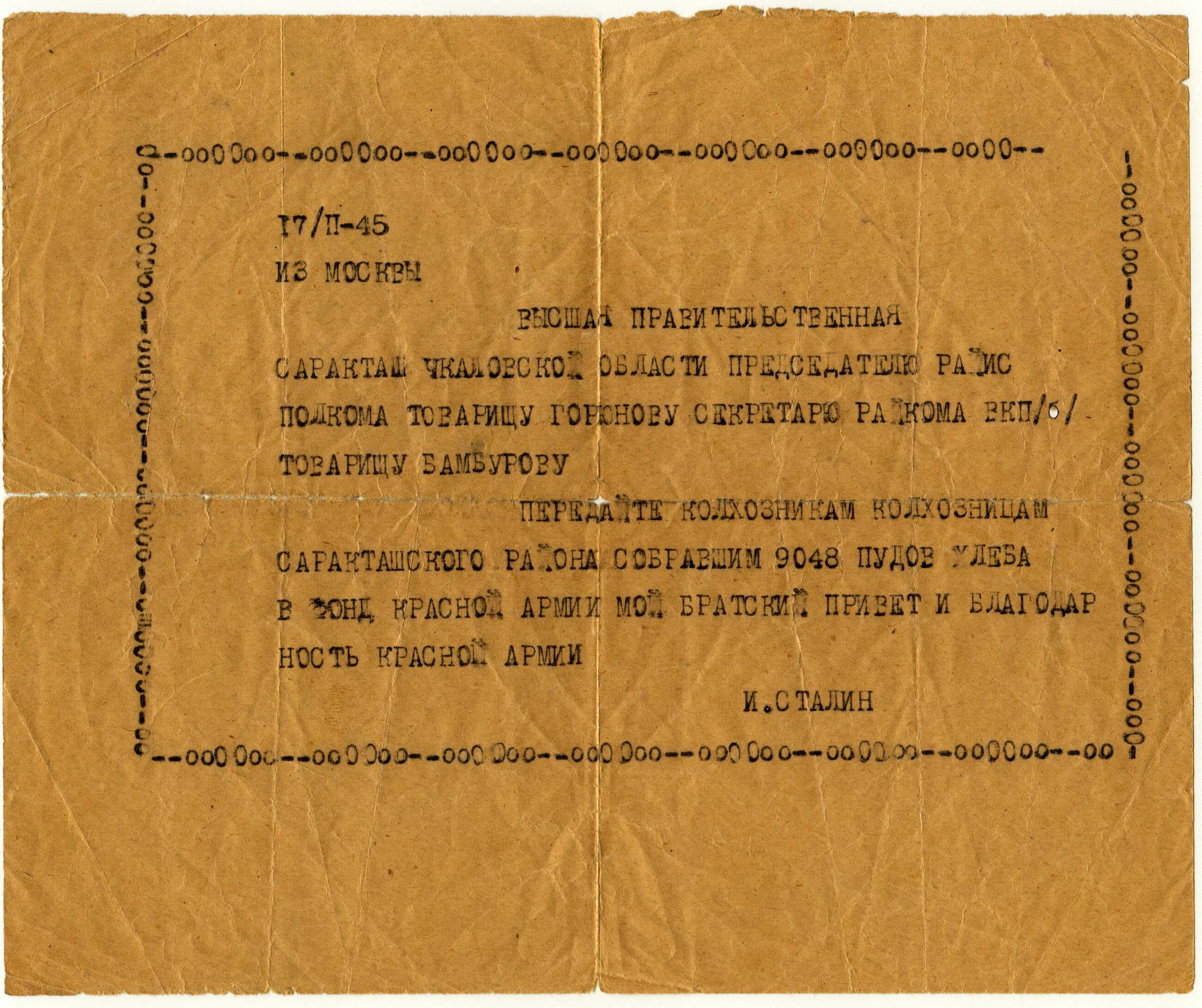 Поздравительная телеграмма от И. Сталина колхозникам Саракташа датированная 1945 годом