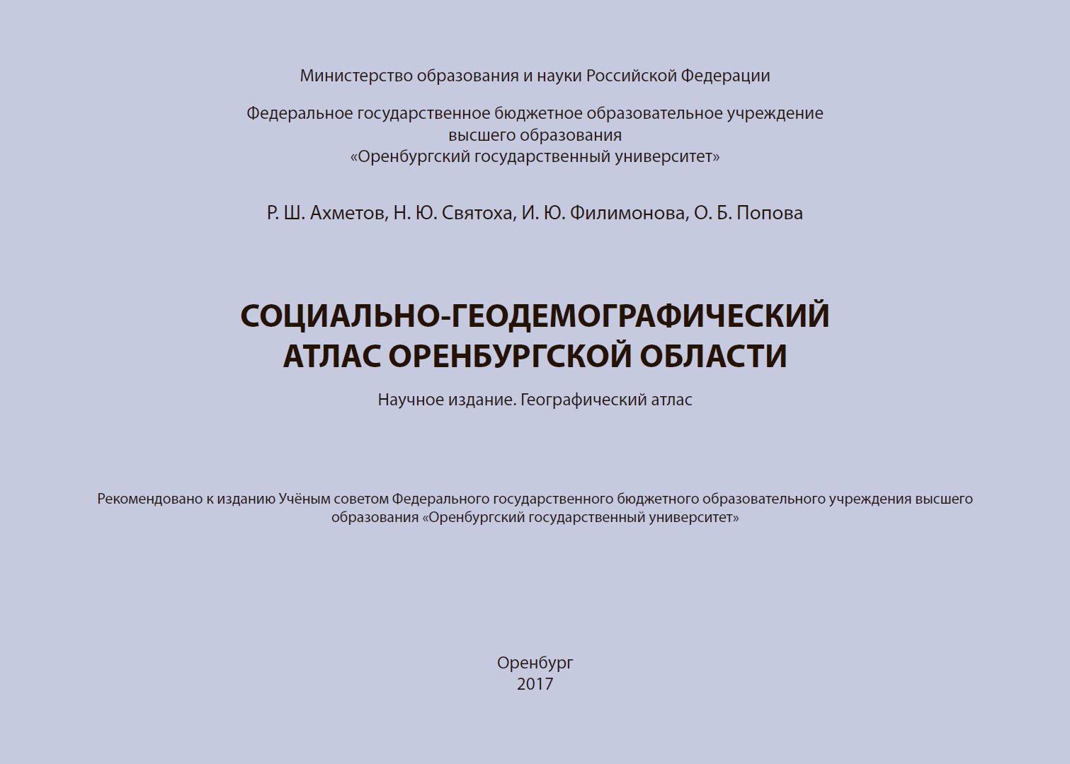 Географический атлас Оренбургской области является коллективной монографией, дающей сведения о природных условиях, естественных ресурсах, населении, промышленности, сельском хозяйстве и социальной сфере региона.