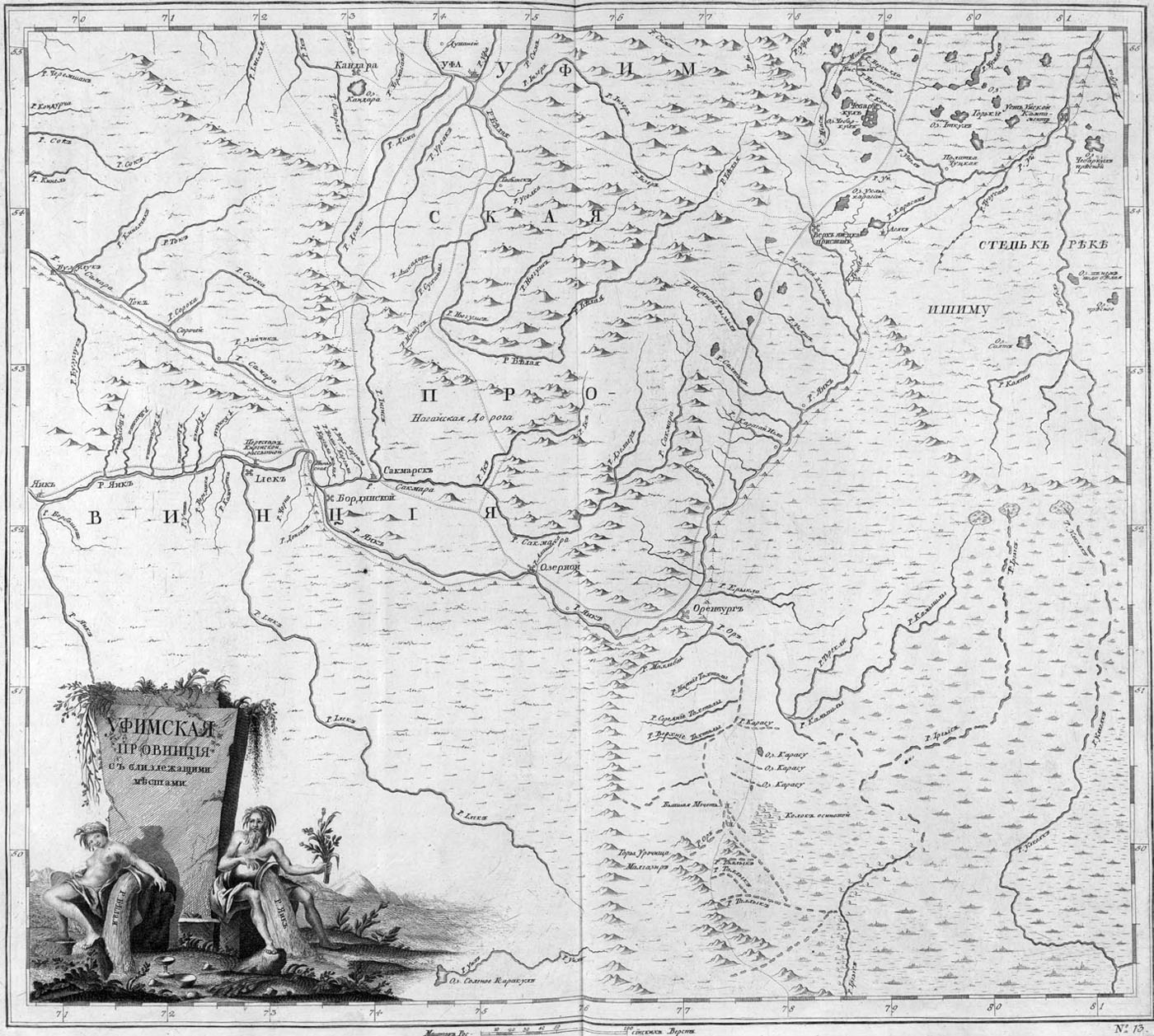 Карта Уфимского наместничества состоящая из 2-х областей разделенная на 13 уездов.