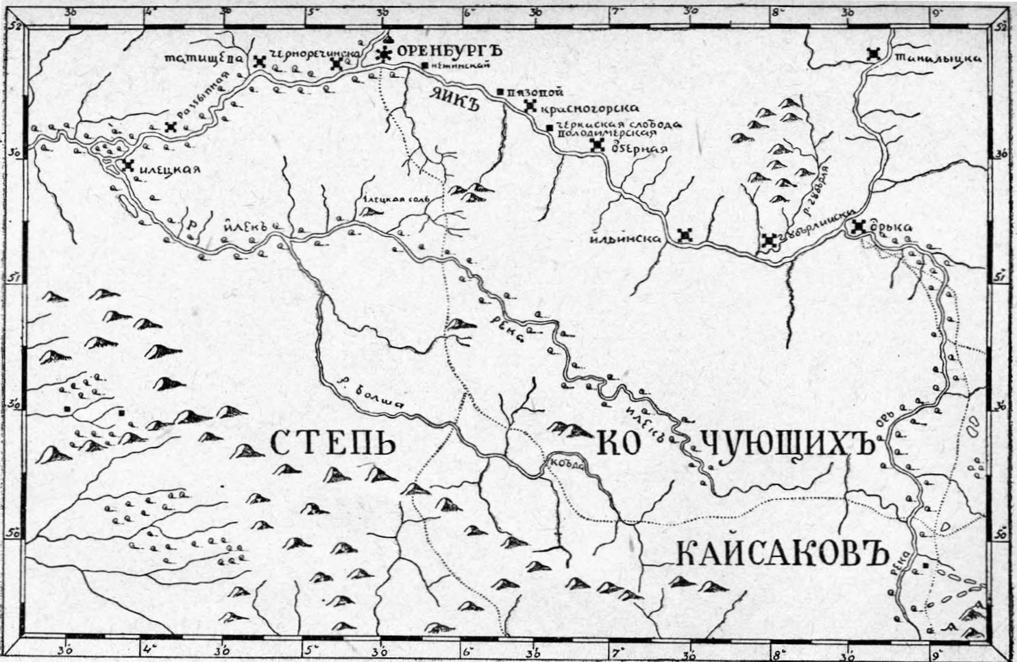 Генеральная карта Оренбургской губернии. 1824 год. С показанием почтовых и больших проезжих дорог, станций и расстояний между оными верст. Сочинена по новейшим и достоверным сведениям в С-Петербурге 1824 года.