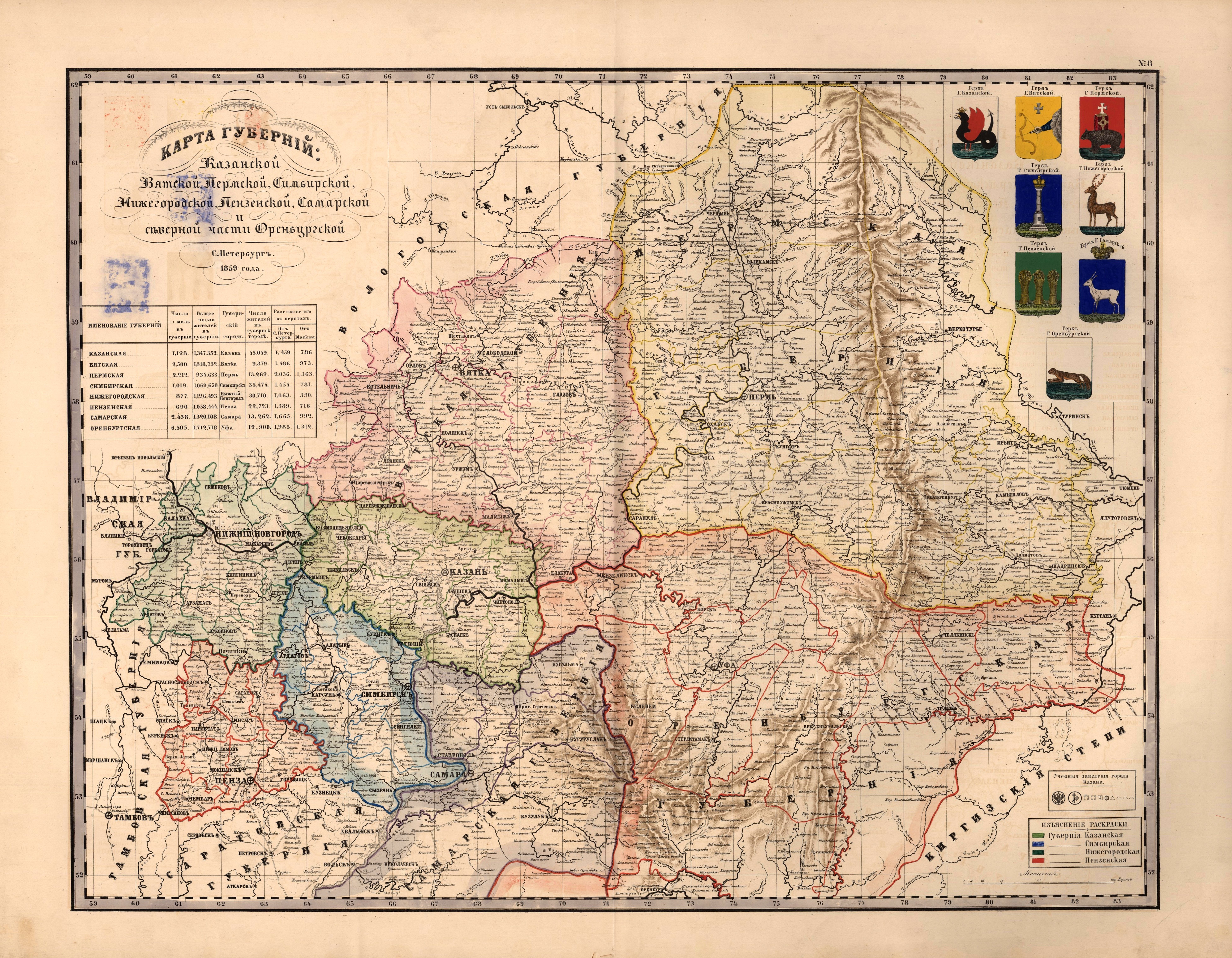 Карта губерний Казанской, Вятской, Пермской, Симбирской, Нижегородской, Пензенской, Самарской и северной части Оренбургской