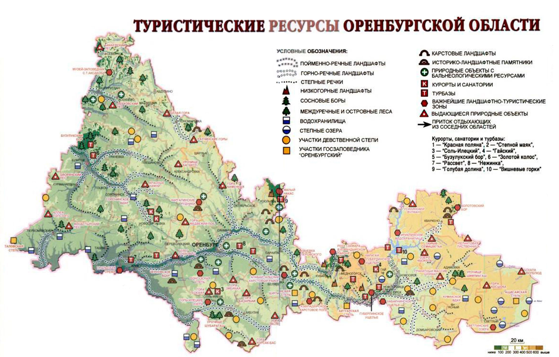 На карте указаны популярные места отдыха и сведения о них. Представлена информация о памятниках природы Оренбуржья.
