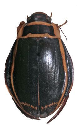 Краткое описание. Самый крупный жук-плавунец в фауне России – длина тела 36–45 мм. Боковые края надкрылий сильно расширены, поэтому тело имеет ромбовидную форму. Окраска тела оливковая с желтой каймой по бокам переднеспинки и надкрылий. Надкрылья самца гладкие, у самки – с 10 продольными бороздками, доходящими до вершины (3).