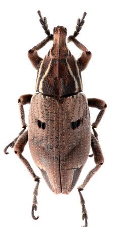 Краткое описание. Тело продолговато-овальное, длина 9,5–15 мм. Крыльев нет. Заднегрудь короткая, короче диаметра средних тазиковых впадин. Третий членик задних лапок двулопастный, снизу с полной губчатой подошвой. Головотрубка короткая, толстая, параллельносторонняя со срединным килем. Лоб вдавлен, со срединным килем и небольшой ямкой. Переднеспинка вдоль боковых краёв с парой узких белых полос, достигающих её переднего края. Щиток едва заметен. Надкрылья в коротких серых волосках и рыжем налёте. На каждом надкрылье за основанием имеется глубокая двойная ямка, за предвершинным бугорком, покрытым белыми волосками – продольная блестящая чёрная линия (3).