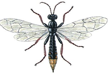 Краткое описание. Насекомое, внешне похожее на осу. Длина тела 9–15 мм. Тело чёрное, матовое, брюшко с третьего сегмента красное. Имеются белые отметины на усиках, лбу, переднеспинке. Ноги черные, лишь вершины бедер и внешний край голеней белые, а лапки буровато-рыжие. Лоб сверху вздутый, с тремя парами блестящих бугорков около глазков. Крылья слегка затемнённые, передние с широкой срединной буроватой перевязью. Яйцеклад длинный, тонкий, в покое втянут в брюшко (1).