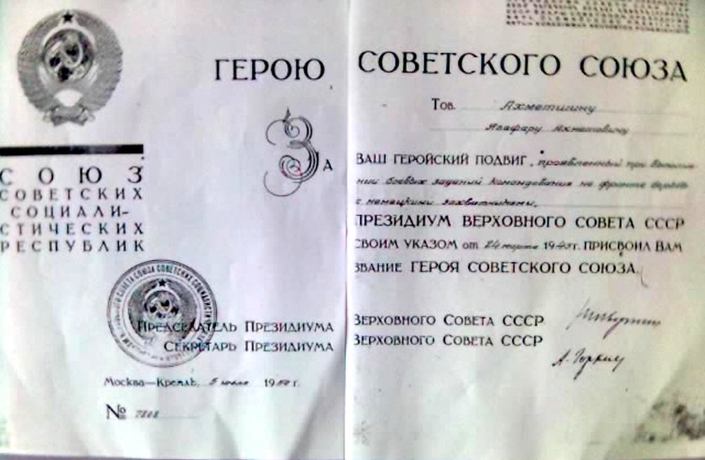 Звание Героя Советского Союза Я.А. Ахметшину присвоено посмертно 24 марта 1945 года за отвагу и мужество, проявленные в боях на территории Польши.
