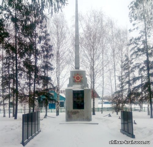 Памятник – скульптурное изображение воина; 2 мемориальные плиты. На постаменте памятника имеется надпись «Вечная слава землякам, павшим в годы Великой Отечественной войны 1941 – 1945 гг.». Памятник изготовлен из бетона, высота 4 м. Памятник изображает фигуру солдата с каской в руке, стоящего на постаменте. Вокруг памятника разбит небольшой сквер, высажены ели и березы. Весь комплекс огорожен металлической оградой. |