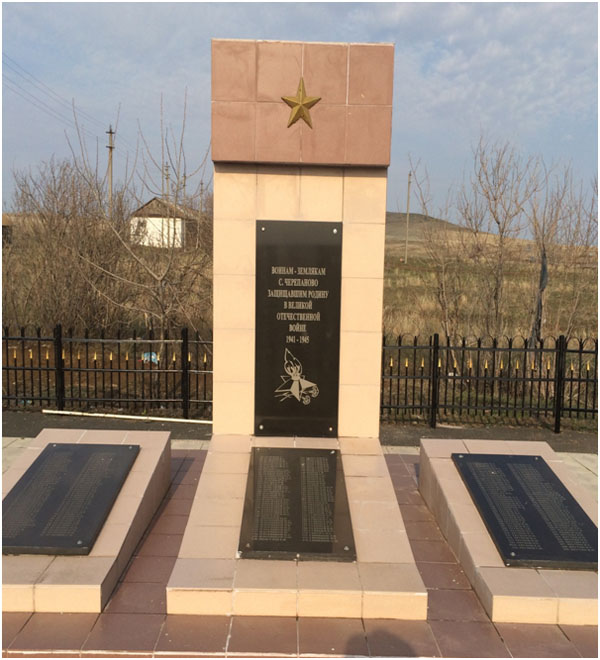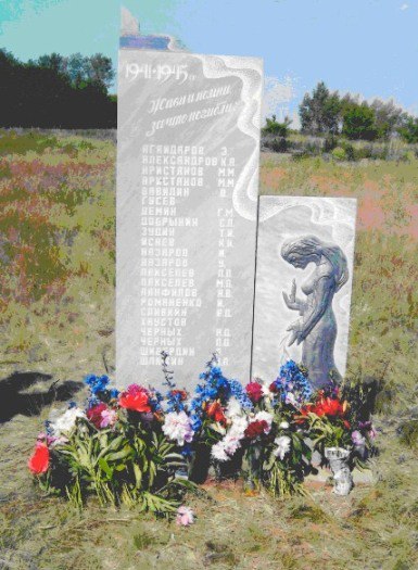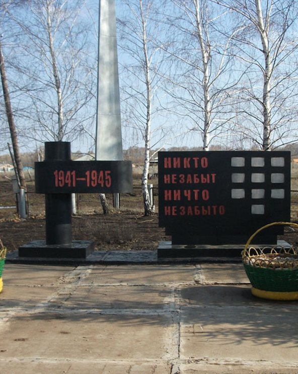 Стела в виде штыка, высота 5 м. Рядом с ней плита, размер 1,20 м х 2,0 м – металлическая, черного цвета с фамилиями погибших земляков. На ней надпись: «Никто не забыт, ничто не забыто». |