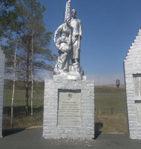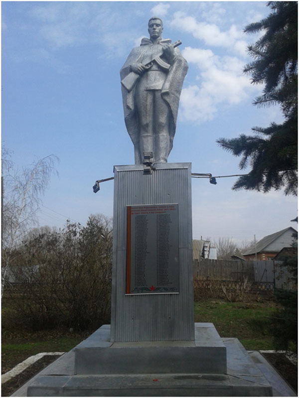 На широкой, трехступенчатой площадке стоит памятник – фигура солдата. Воин держит в левой руке автомат, правая рука плотно прижата к туловищу. Суровый взгляд устремлен далеко вперед. Трехметровая скульптура на высоком пьедестале видна со всех сторон. На памятнике надпись: «Воинам, павшим в годы гражданской и Великой Отечественной войн». Около памятника сооружены специальные плиты-тумбы, на которых уложены мемориальные плиты. На плитах высечены фамилии односельчан. |