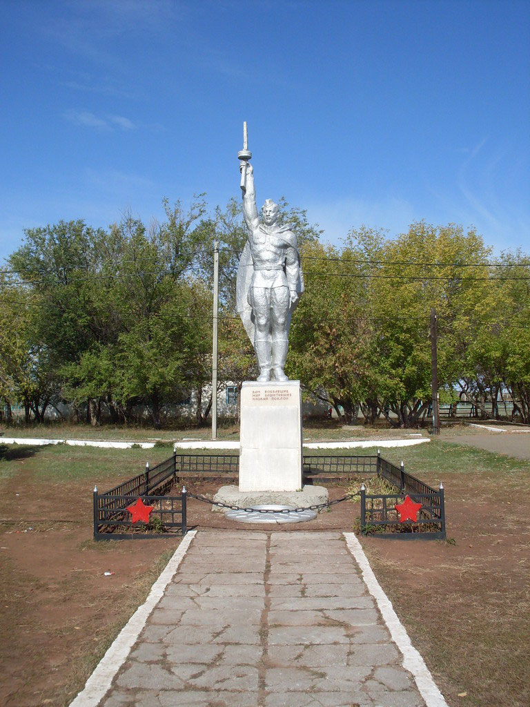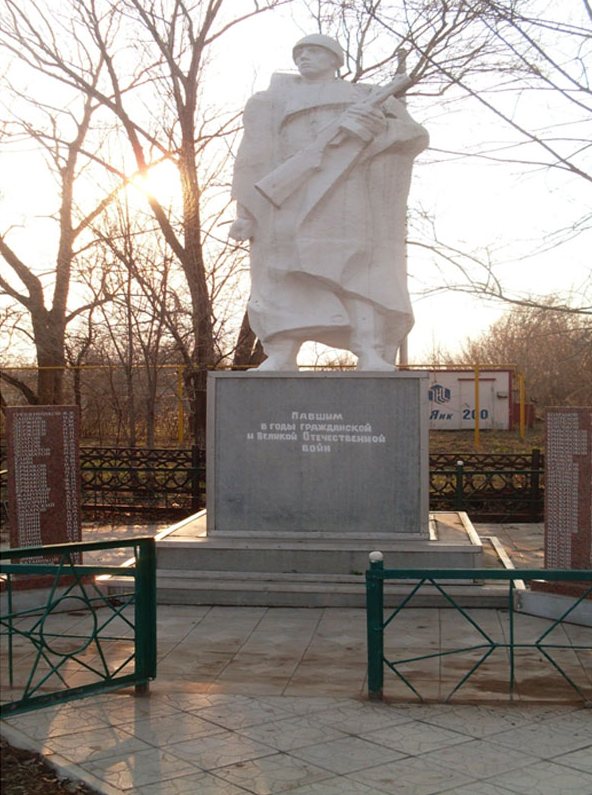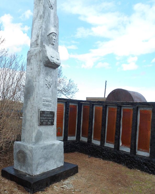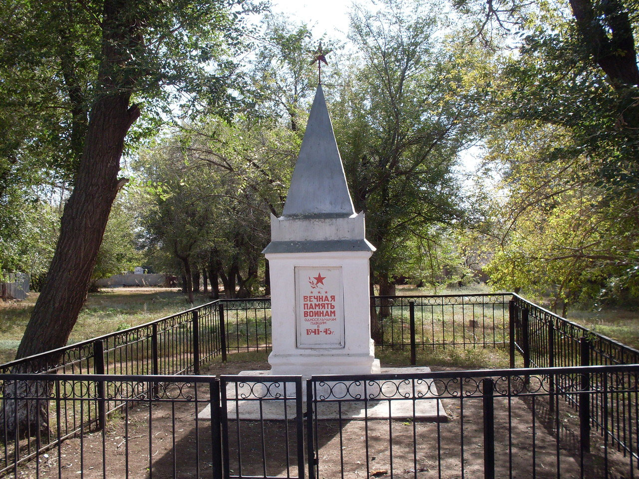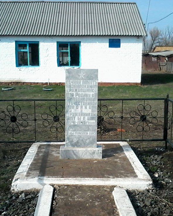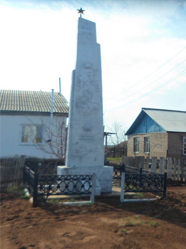 На высоком постаменте возвышается стела, в верхней части ее – пятиконечная звезда. Высота 6 м., длина 90 см., ширина 50 см. В центре стелы – барельеф неизвестного солдата, над головой солдата – орден «Победы», а под ним орден «Отечественной войны 1 степени». Над постаментом, у основания стелы прикреплена мемориальная доска с надписью «Героям села, погибшим в годы Гражданской и Великой Отечественной войны 1917 – 1945 гг.». С правой стороны от памятника находится бетонированная стена, на которой помещены фамилии погибших односельчан в годы войны. Памятник сделан из бетона, покрашен серебрянкой. |