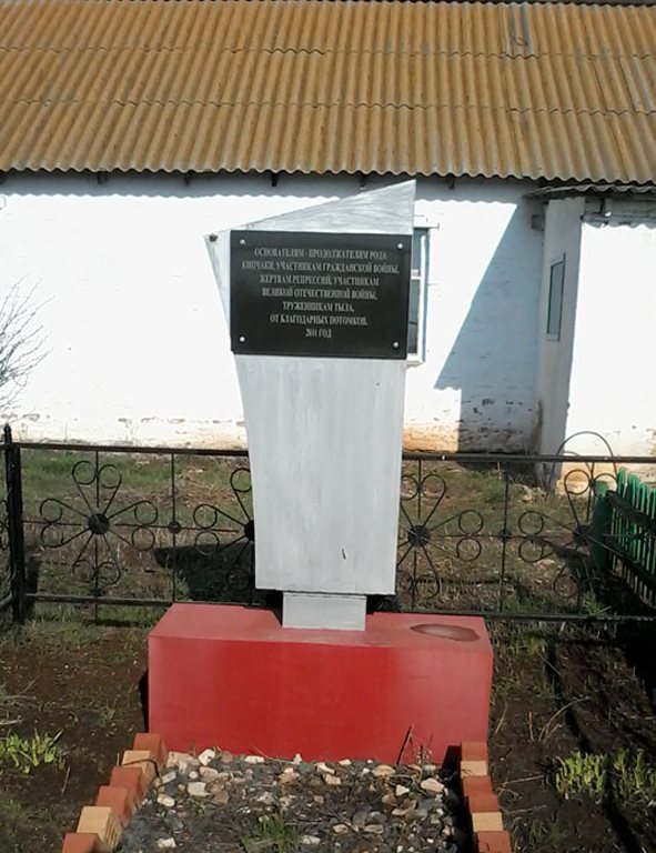 Стела с надписью «Основателям – продолжателям рода кипчаки, участникам Гражданской войны, жертвам репрессий, участникам Великой Отечественной войны, труженикам тыла – от благодарных потомков. 2011 год». |