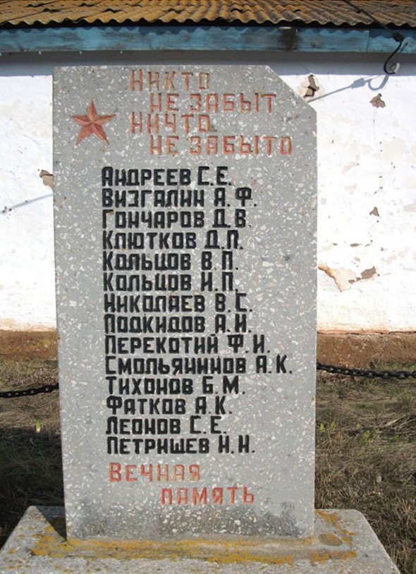 Стела изготовлена из мраморной крошки с цементом, серого цвета, Размер 0,5м. х 1,10м. На плите, стоящей вертикально, высечено и покрашено красным цветом надпись «Никто не забыт, ничто не забыто». Под надписью 14 фамилий погибших односельчан (фамилии черного цвета). Список завершает надпись «Вечная память» красным цветом. В верхнем левом углу изображена Красная пятиконечная звезда. Плита установлена высотой 30 см., кирпичная кладка. Высота 15м. Стела окружена металлической цепью, размером 2м х 2,5м,на столбах, окрашена в черный цвет. |