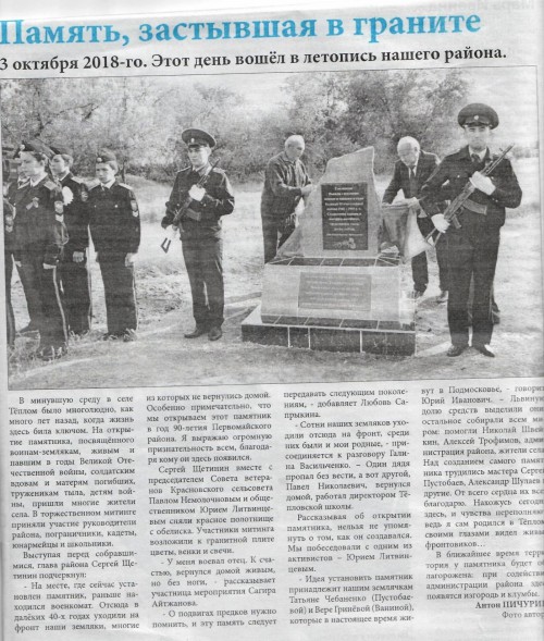 Надпись на нижней: «На этом месте располагался военный комиссариат Тепловского района Чкаловской области. Из 5109 мобилизованных на фронт воинов – жителей нашего района 2557 героически погибли в боях за Родину».