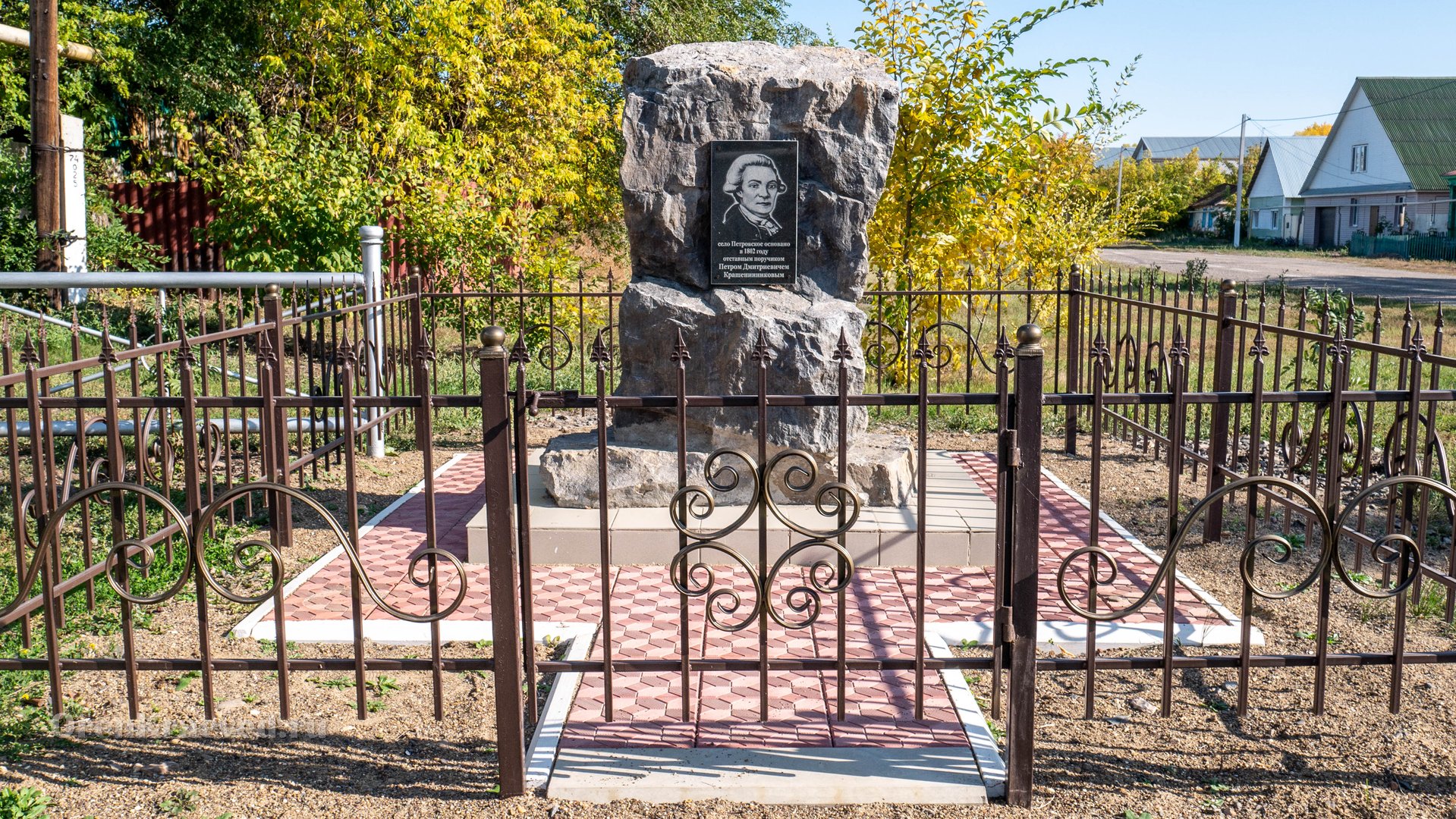 Памятник представлен в виде камня с закрепленной табличкой. На табличке изображен портрет основателя села, ниже текст: «село Петровское основано в 1802 году отставным поручиком Петром Дмитриевичем Крашенинниковым». Памятник окружен оградой. |