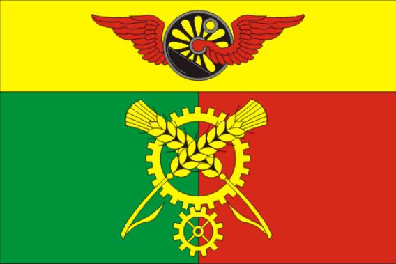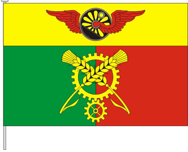 Описание: Прямоугольное двухстороннее полотнище с соотношением сторон 2:3, повторяющее композицию герба муниципального образования в желтом, красном, зеленом цветах.