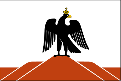 Описание: Флаг представляет собой белое прямоугольное полотнище с соотношением сторон 2:3, несущее изображение фигур герба города Орска: черного орла с желтым клювом и в желтой императорской короне, сидящего на красной горе с тремя вершинами; гора изображена вплотную к книжному краю полотнища. Флаг разработан на основании герба города Орска и воспроизводит его символику.
