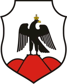 Описание: «В серебряном поле на червленной (красной) горе о трех вершинах, черный орел, обращенный вправо и обернувшийся, коронованный золотой императорской короной XVIII века, с опущенными крыльями и золотым клювом».