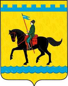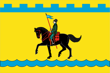 Описание: В золотом поле оренбургский казак в форме и снаряжении конца XIX века (черной папахе с синим верхом, зеленой униформе с лазоревыми погонами и лампасами, чёрных сапогах, при шашке с золотой рукоятью, в чёрных отделанных золотом ножнах), держащий в руке красную пику с лазоревым наконечником и сине-серебряным значком (хорунжевкой), сидящий на черном идущем коне с червлеными упряжью и седлом, сопровождаемый во главе щита узким лазоревым стенозубчатым сверху поясом, а в оконечности - лазоревым же узким поясом, вверху выщербленным, внизу чешуйчатым.