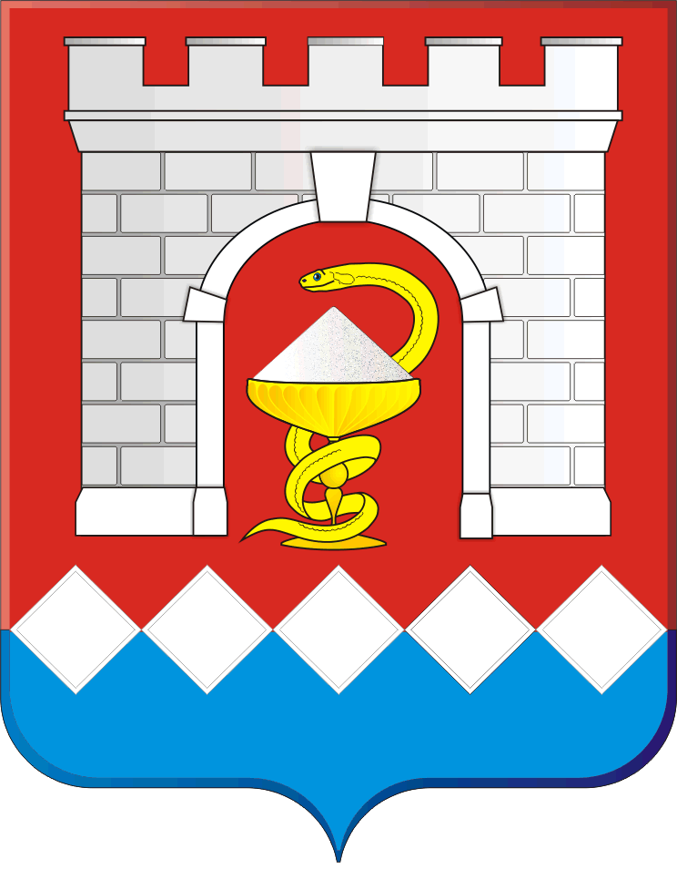 Описание: В червлёном поле серебряная крепостная башня с с червленой аркой, в проеме которой серебряная змея с золотым языком, обвившаяся вокруг золотой чаши с серебряной солью. Лазоревая оконечность окаймлена вверху составленным из пяти серебряных ромбов поясом.