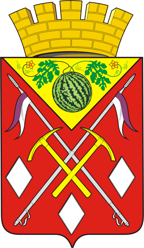 Описание: В червленом (красном) поле положенные накрест серебряные казачьи пики с пурпурно-серебряными значками о двух косицах каждая, поверх них также накрест положены две золотые кирки, все сопровождается по сторонам и снизу тремя серебряными веретенами, в треугольной золотой главе арбуз натуральных тинктур с двумя зелеными листьями и двумя цветками натуральных тинктур.